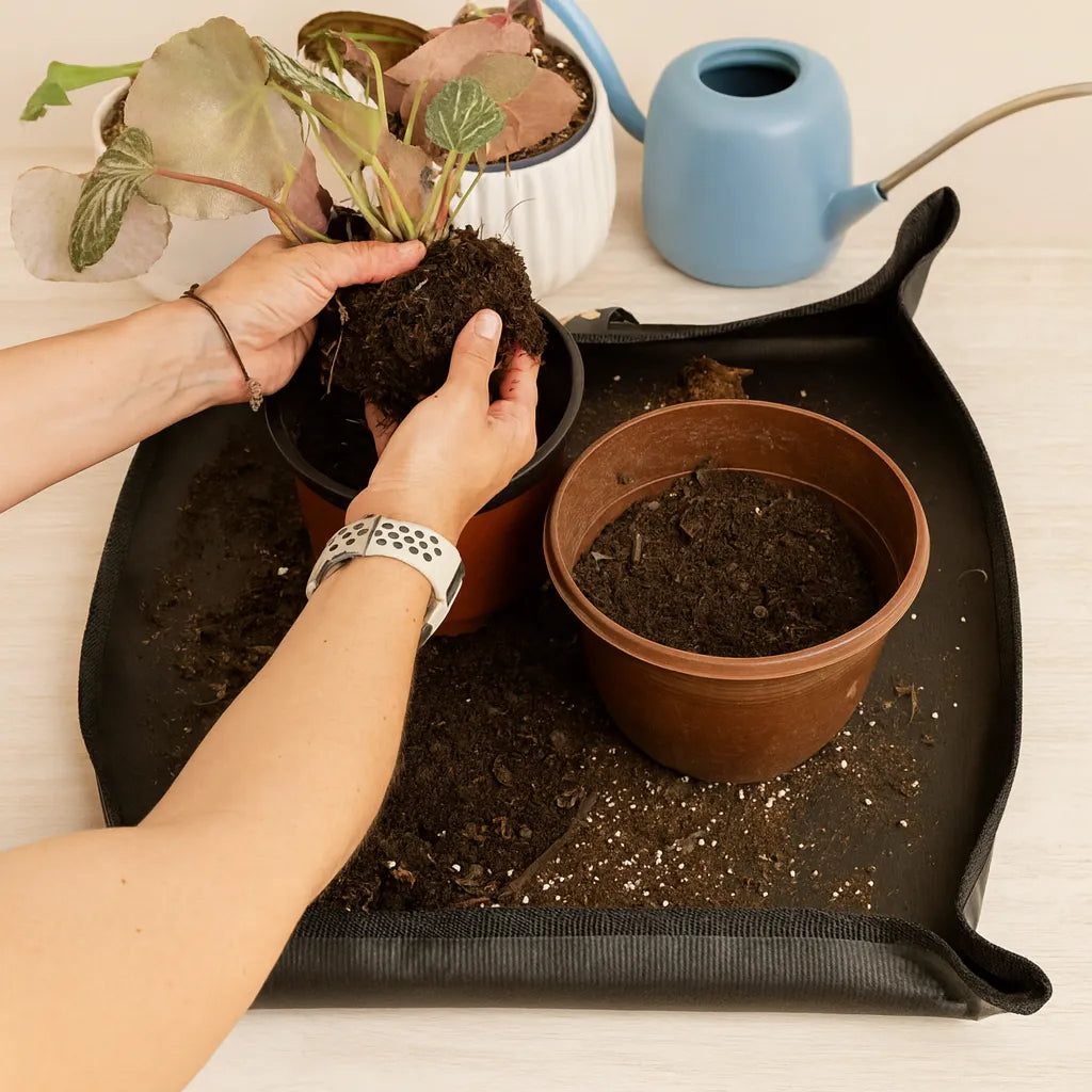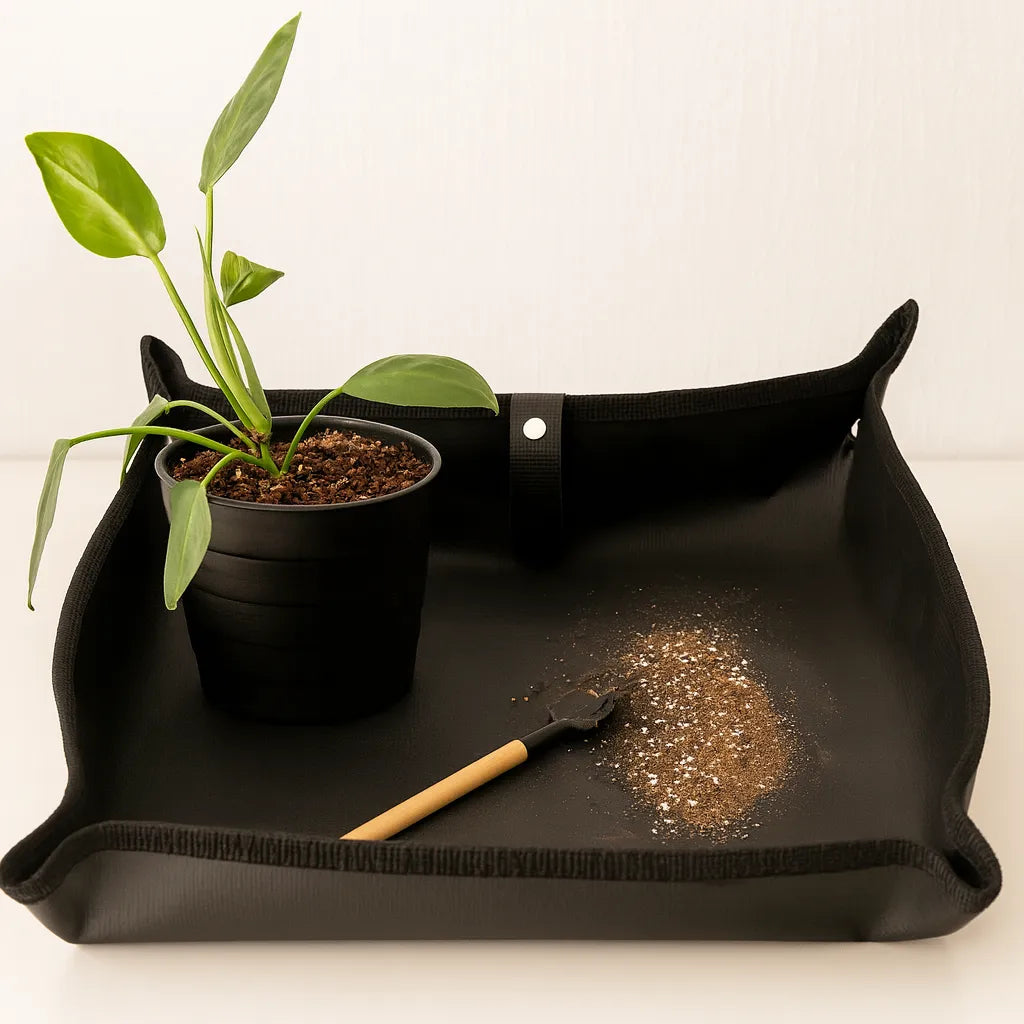 Fabricada con tela resistente al agua, esta alfombra es perfecta para trasplantar sin preocuparte por los derrames.