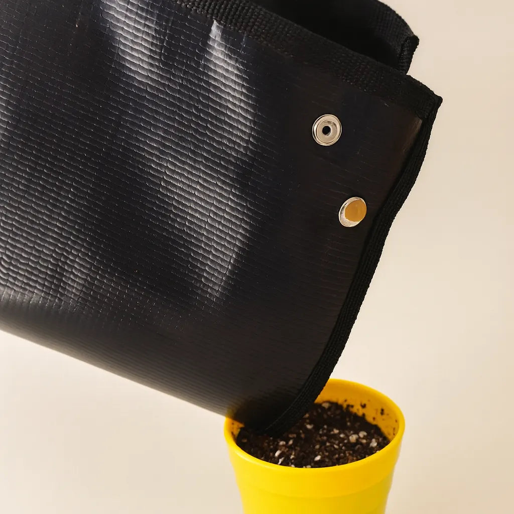 Conecta los broches de la alfombra para convertirla en un práctico contenedor. Ideal para trabajar con tus plantas sin preocuparte por el desorden.